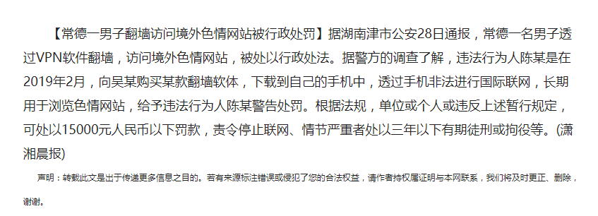 常德一男子翻墙访问境外色情网站被行政处罚。