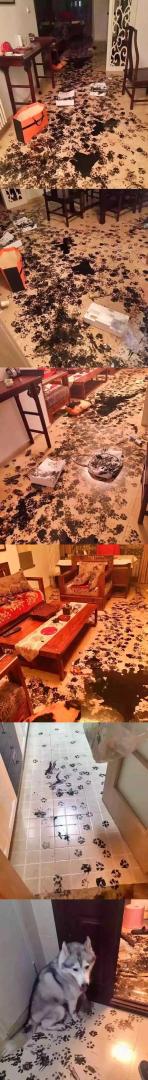 哈士奇作画现场。